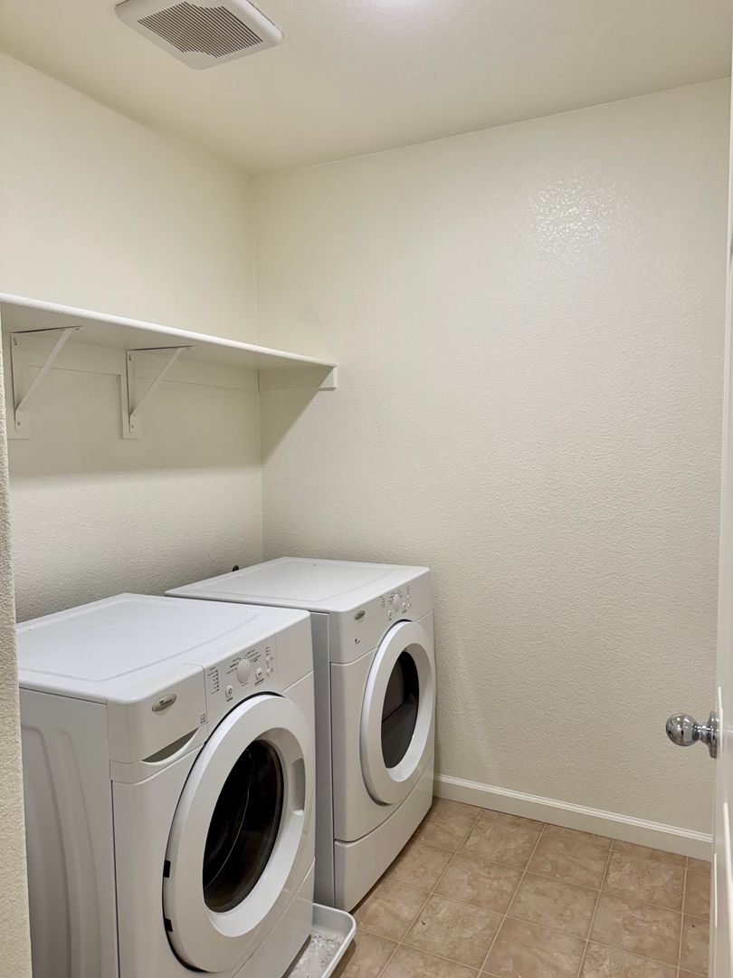 Refrigerator, washing machine, and dryer are included.